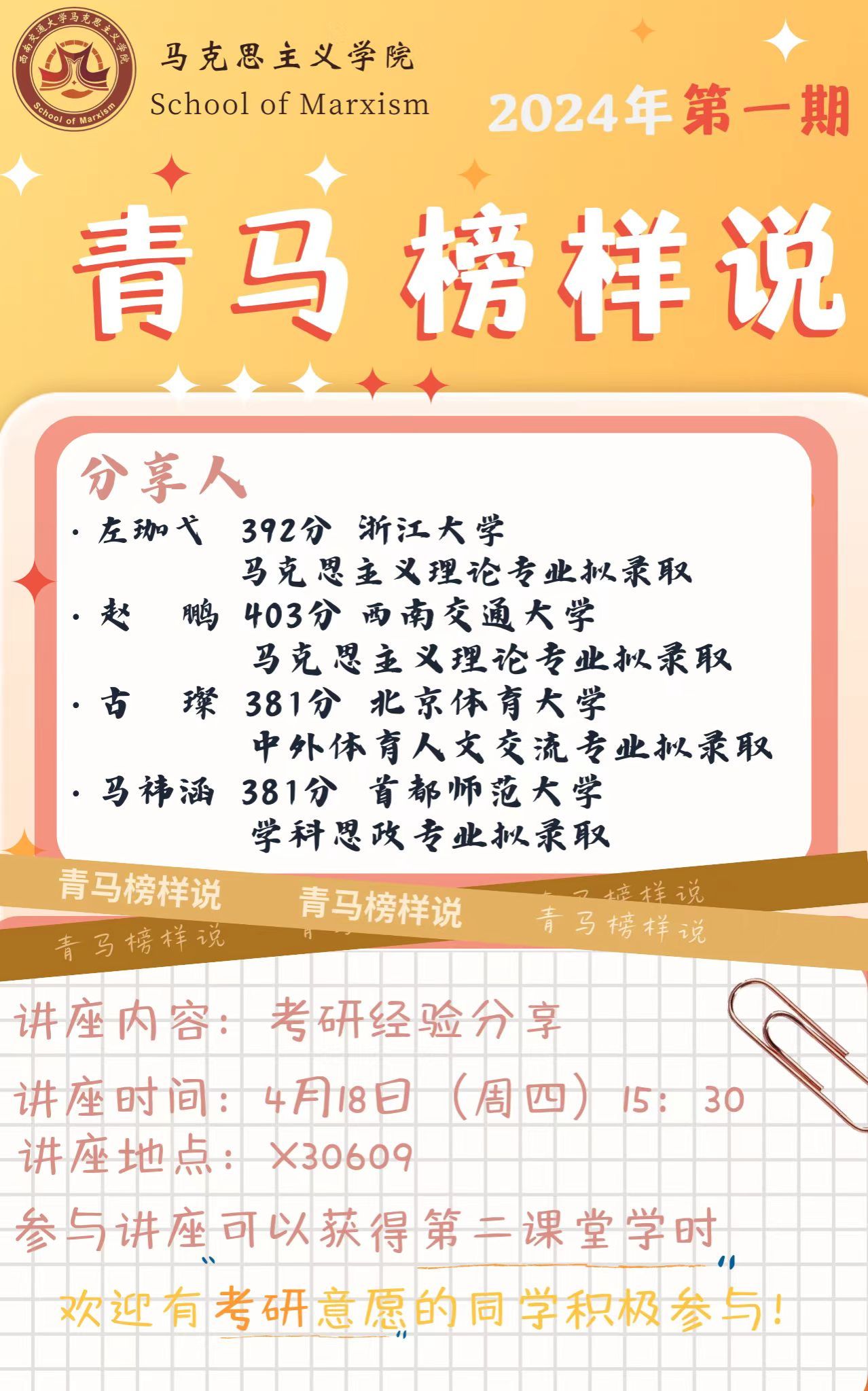 为了发挥朋辈教育作用,为意向考研的同学搭建交流学习的平台,让同学们明确考研的方向与目标,了解考研择校、备考等方面的注意事项,太阳成集团tyc539将于4月18日15:30组织“青马榜样说”考研经验分享会。现将有关事宜通知如下: