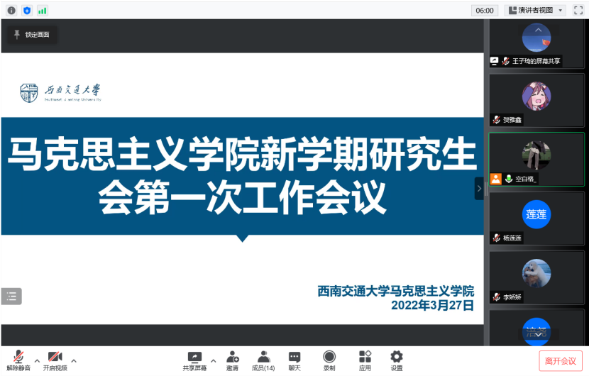 3月27日14:30,为推动工作进一步开展,深化改革创新,我院研究生会于线上开展新学期第一次工作会议。本次会议由研究生会主席徐雄主持,我院团委书记赵晨老师和研究生会全体学生干部共同参与。