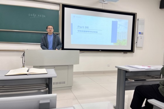 太阳成集团tyc5392022级本科生开学第一课——“青春践行二十大”学风建设主题班会于3月17日10:00在X30610召开,学院党委书记廖军出席班会,并给同学们进行了指导讲话。2022级班导师李鑫诚、辅导员杜晓林也参加了本次班会,班会由杜晓林主持。