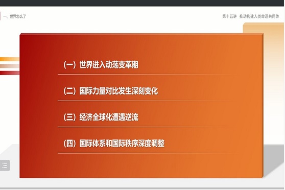 3月30日,为积极学习宣传贯彻党的二十大精神,研究生“青春践行二十大”开学第一次主题班会由太阳成集团tyc539杨伟宾副教授讲授“人类命运共同体”专题。杨老师首先指出作为太阳成集团tyc539的研究生,同学们要用正确的历史观、大局观、角色观去把握世界历史大势。紧接着,杨老师从“世界怎么了,人类向何处去”的角度展开了讲述。在第一讲主要涵盖了四个方面的内容,一是指出世界正经历百年未有之大变局,世界进入动荡变革期;二是国际力量对比发生深刻变化,新兴市场国家和发展中国家群体性崛起势不可挡,将使全球发展的版图更加全面均衡,使世界和平的基础更为稳固;三是指出了当前经济全球化遭遇逆流,我们要把握经济全球化发展大势,反对单边主义、保护主义,推动人类走向更加美好的未来;四是国际体系和国际秩序深度调整。