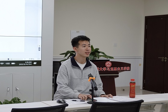 比起一场经验分享会,这更像是一场自然而亲切的交谈会。吴昊以“两问”开启与同学们的对话,在提及为什么来到马院时,转专业到我院的王筠然同学这样回答:“我提前了解了马院的一些信息,发现我对马院的课程比较感兴趣,而且语言对我来说更多的是一种学习的工具,于是便有了换专业这个念头。”在放松的问答互动之中,本次活动沙龙的氛围也渐渐轻松活跃起来。