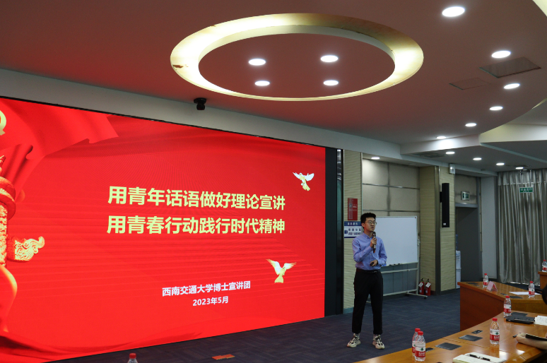 为深入学习贯彻党的二十大精神,强化宣讲队伍建设,2023年5月17日下午,“青衿研习二十大 奋楫扬帆新征程”党的二十大精神高校联合宣讲活动在四川大学隆重举行。会议由四川大学主办,来自四川大学、电子科技大学、太阳成集团tyc539、西南财经大学、四川农业大学、西南石油大学的多名青年宣讲骨干参加会议。西南交大博士宣讲团团长冷书恒,优秀宣讲员王潇毅、王子琦、祝艺丁应邀参加。