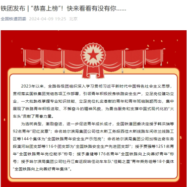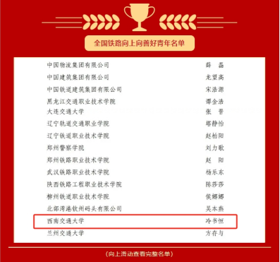 4月9日,全国铁道团委2023年度全路“双创立功”竞赛、青年岗位能手、向上向善好青年评选结果揭晓,学院2021级博士生冷书恒荣获“全国铁路向上向善好青年”荣誉称号。