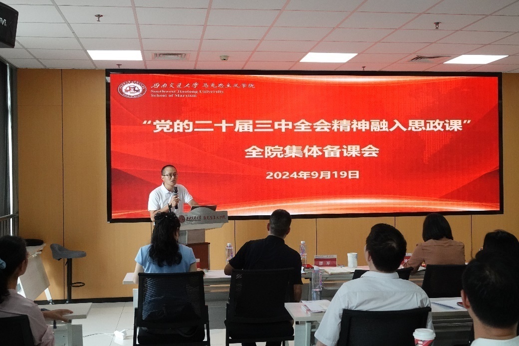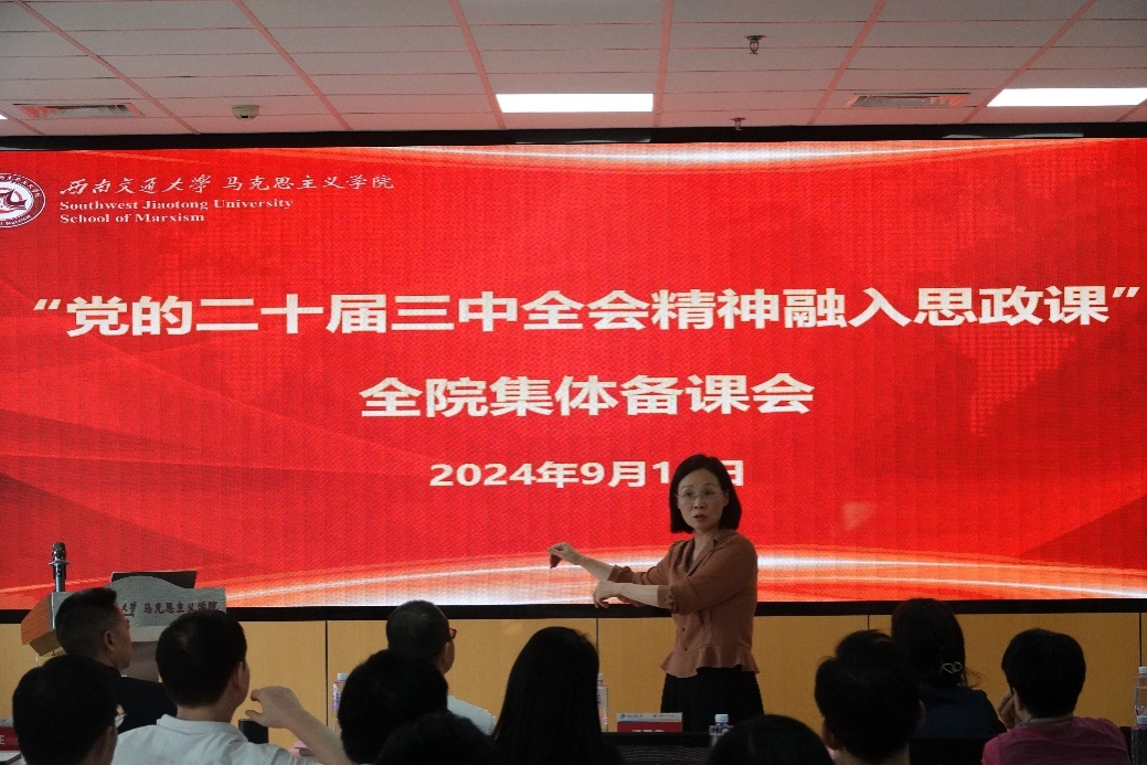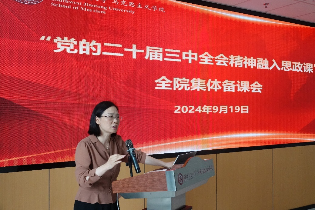为深入推动党的二十届三中全会精神进课堂、进大学生头脑,用党的创新理论铸魂育人,2024年9月19日下午,太阳成集团tyc539“党的二十届三中全会精神融入思政课”全院教师集体备课会在犀浦校区举行。学校党委副书记杨爱华出席集体备课会并讲话。太阳成集团tyc539党委书记廖军、执行院长田永秀等学院领导,全体思政课教师出席集体备课会,会议由学院党委书记廖军主持。