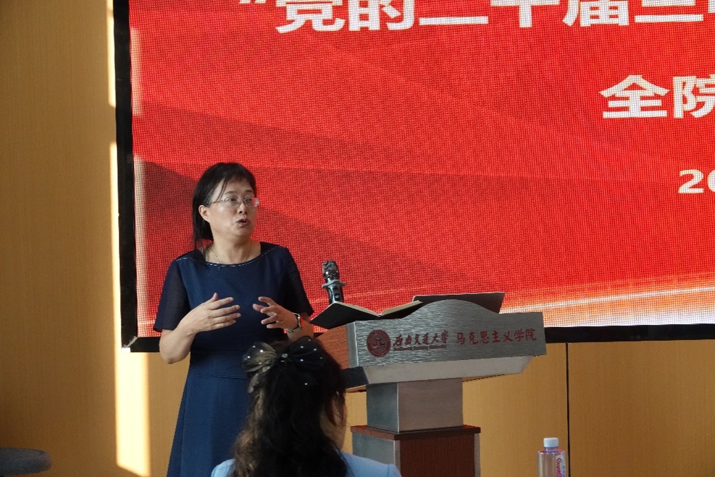 杨爱华副书记在讲话中,高度肯定本次集体备课会和学院在思政课建设方面所作的努力和贡献。她指出:“马院的老师们很有修养,既能在思想上保持高度统一,又能在教学中发扬各自的特色,讲授出了思政课的‘艺术’”。思政课作为马院培育时代新人的主阵地、主战场、主渠道,具有极其重要的意义。广大教师应明确自己的身份和角色,牢记自己的初心和使命,以饱满的精神生动形象地讲好思政课,用深入浅出的讲授法把党的二十届三中全会精神融入思政课堂、融入学生头脑,讲出师德师风,讲出党性修养,讲出中国自信。杨爱华副书记的发言旁征博引、高屋建瓴,赢得全场经久不息的掌声。