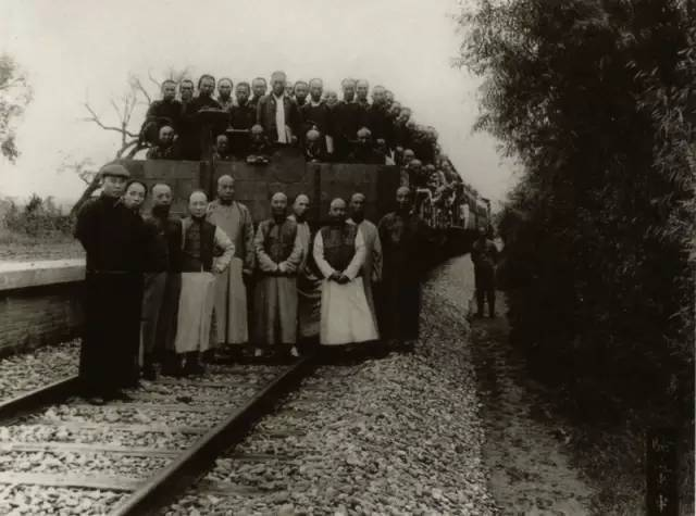 京张铁路竣工后,首先由验道专车进行试验运行。照片中验道车上满载修筑铁路的工人和技术人员。车前合影的技术人员中左一为詹文彪(技术工作人员)、右三为詹天佑。