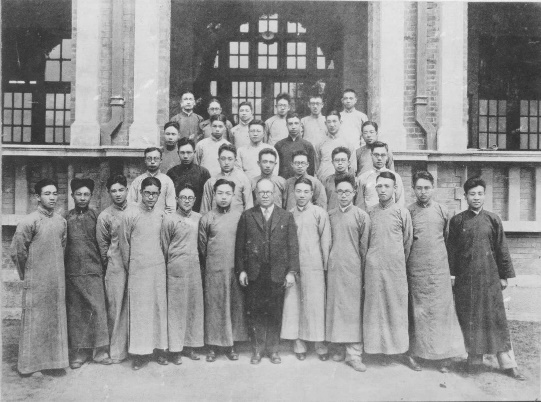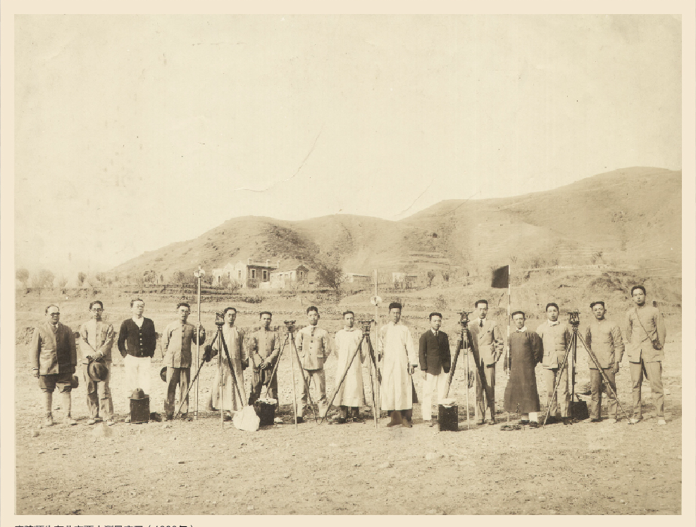 伍镜湖(左1)指导我校1929届土木系大四学生在北京西山进行测量实习