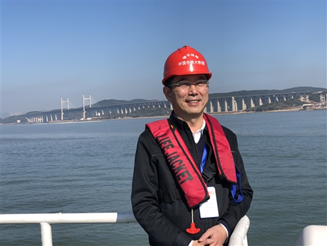 高宗余在建设中沪苏通长江公铁大桥前留影