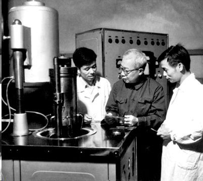 庄育智(右一)、李薰(中)等人在金属所实验室讨论难熔金属的熔炼问题